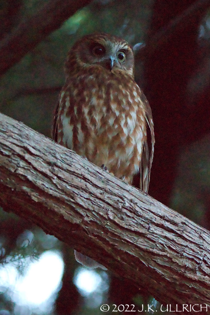 Until friends sent me video of a tiny white owl bouncing on a branch, a fluffy mote beside the streetlight. They’d discovered a family of southern boobooks nesting in their neighborhood. I can’t imagine a more delightful name for Australia’s smallest owl. Boo! evokes startled eyes, and book echoes the bird’s folkloric association with wisdom. Eagerness to see a new bird overcame my evening inertia. I dragged my lawfully wedded mosquito magnet to the site at dusk. Our friends happened by on their evening walk just as we parked the car, and pointed out the exact tree. I squinted into the dense conifer branches, but no avian shapes appeared. Insectoid chirps drifted from the jade shadows.