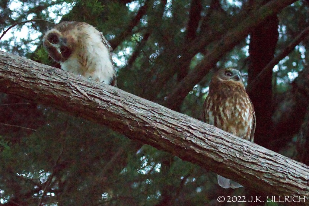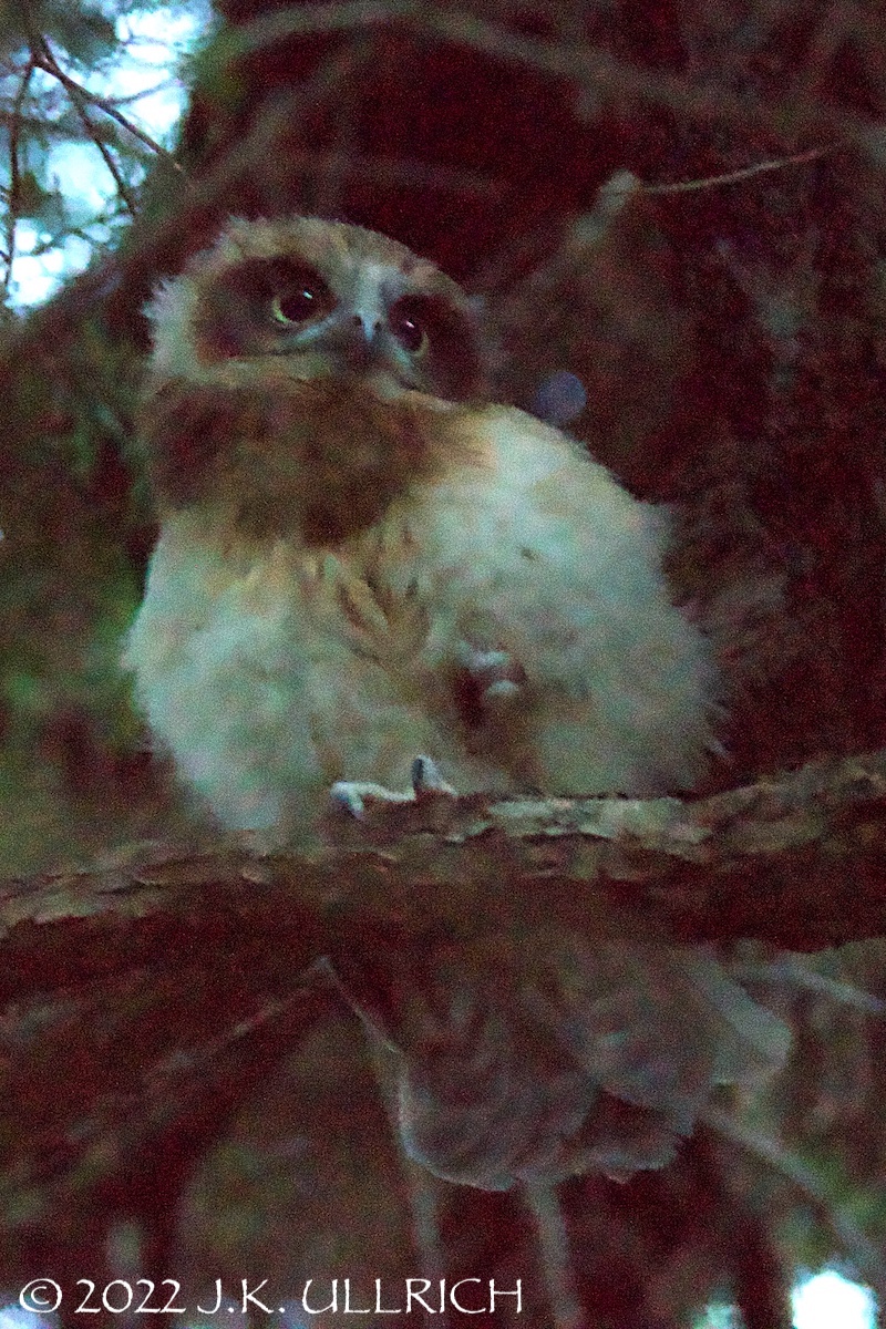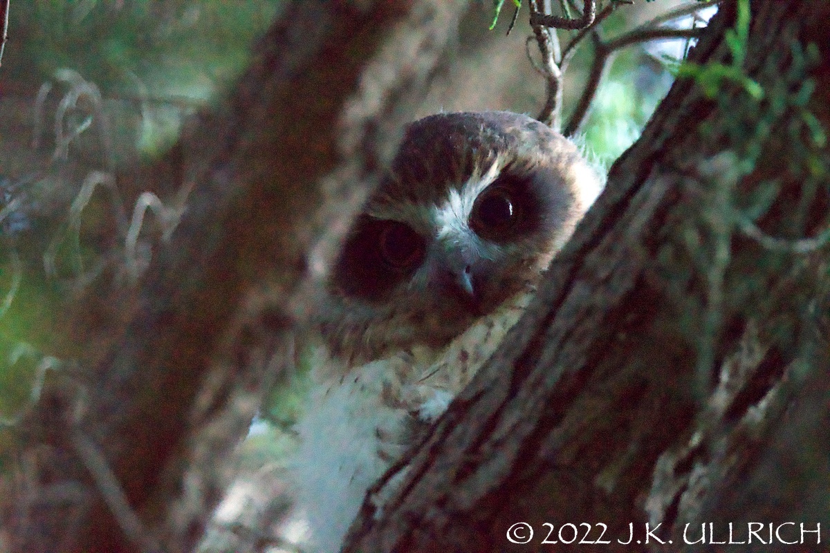 Five birds, two adults and three juveniles, were just waking up. The fledglings still wore fluffy white down. Our presence didn’t disturb them at all. Instead, they seemed curious. They peered through the branches, bobbing their heads in comically bouncy circles, and tilting their faces almost vertical to study the strange featherless creature below. From a distance they looked like cartoon spacemen, with flat faces and lightless ocular pits where the eyes should be. But a closer look revealed sweet, fuzzy expressions. Golden irises shone in the gloaming. The boobooks gamboled around the branches. They seemed to gain energy in inverse proportion to the dimming light.