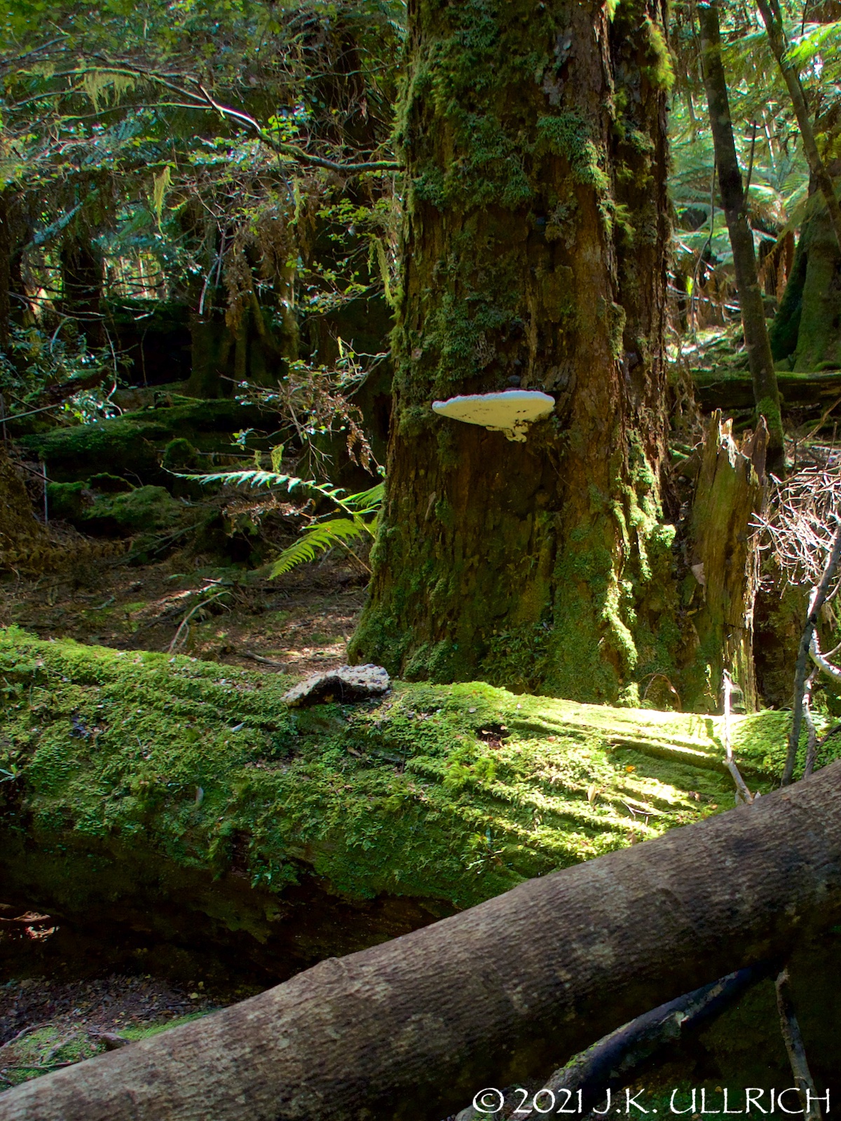 Then something dark loomed in the windshield. Not a thundercloud, but a wall of trees rising abruptly behind their spindly domesticated cousins. I’ve never seen such a stark border between tended landscapes and wilderness. It looked like a fortress, the rainforest’s last bastion against a century of industrial onslaught. I half expected a portcullis to raise when we drove over the line to a small car park and stepped into the jungle. Green engulfed us. Ferns as long as I am tall cast feathery shadows over the ground. Thick green moss pillowed everything from tree roots to fallen logs. Lichens the size of dinner plates adorned tree trunks.