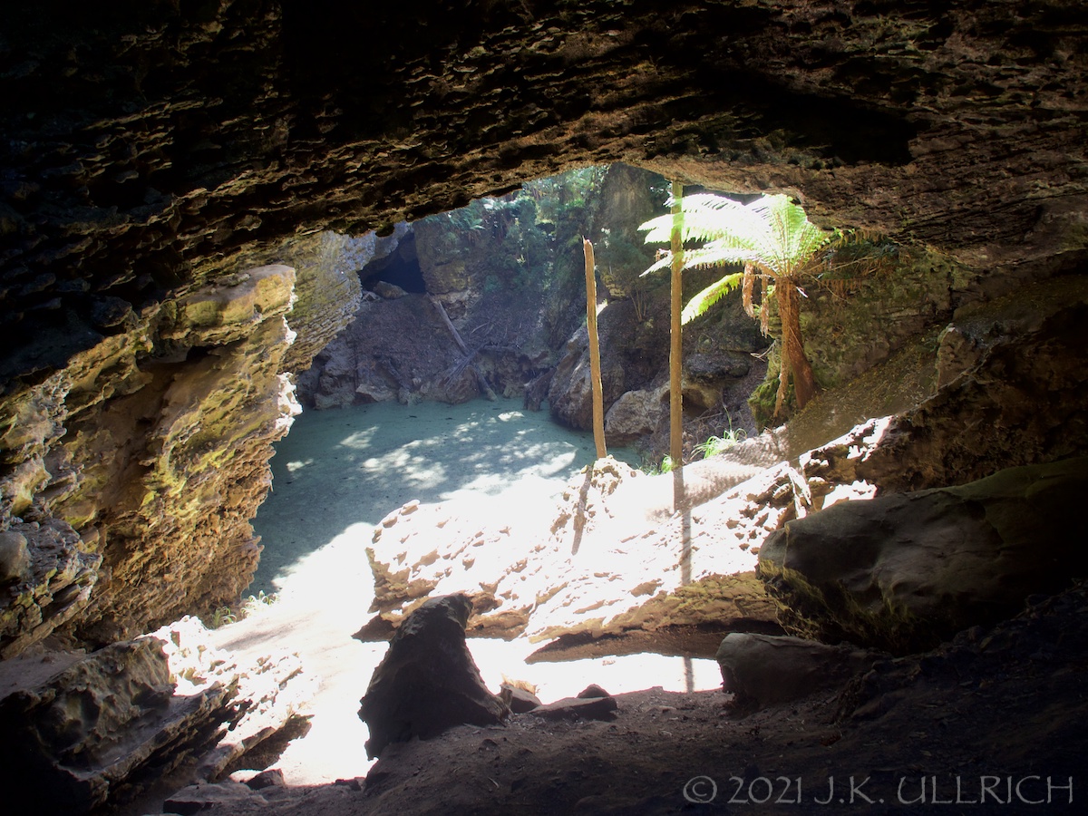 Although the trees weren’t as imposing as the sequoias I’d once visited in California, they gave me the same heightened awareness of how small and transient my human life is compared to an ancient forest, and the thrill of knowing we’re composed of the same carbon. I don’t mind the humbling perspective, but it must have bothered the many people who’d scratched their names into the stone arch, desperate for some record of their presence. Late morning sun illuminated a sylvan pool and made the manferns glow, all framed within the arch like a stained glass window in nature’s cathedral.
