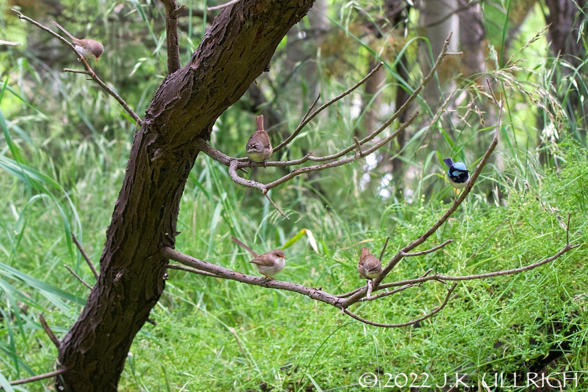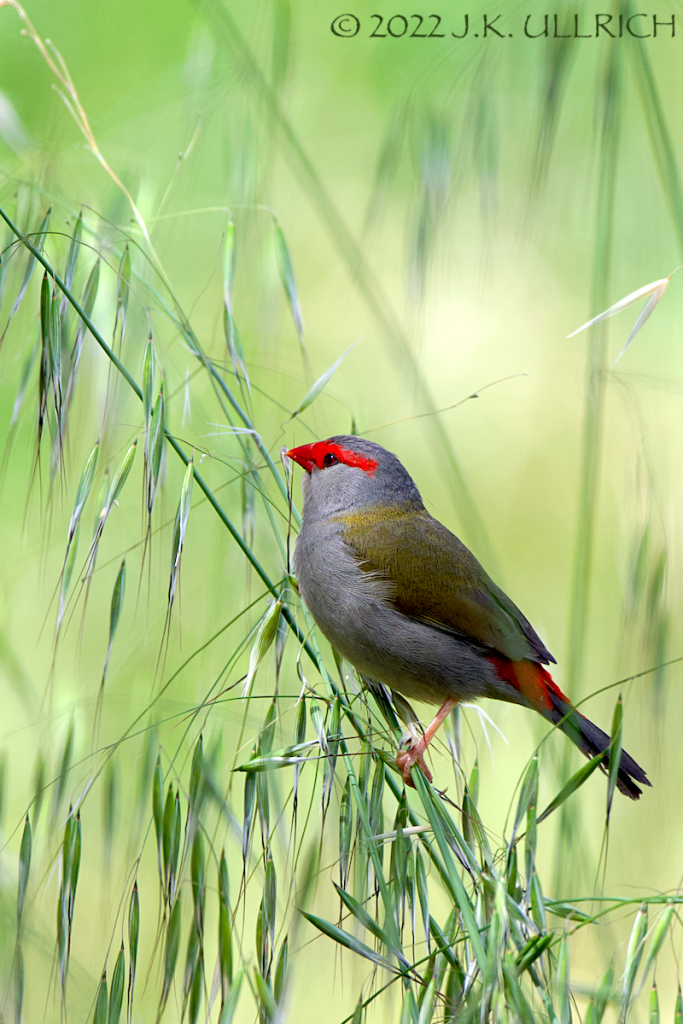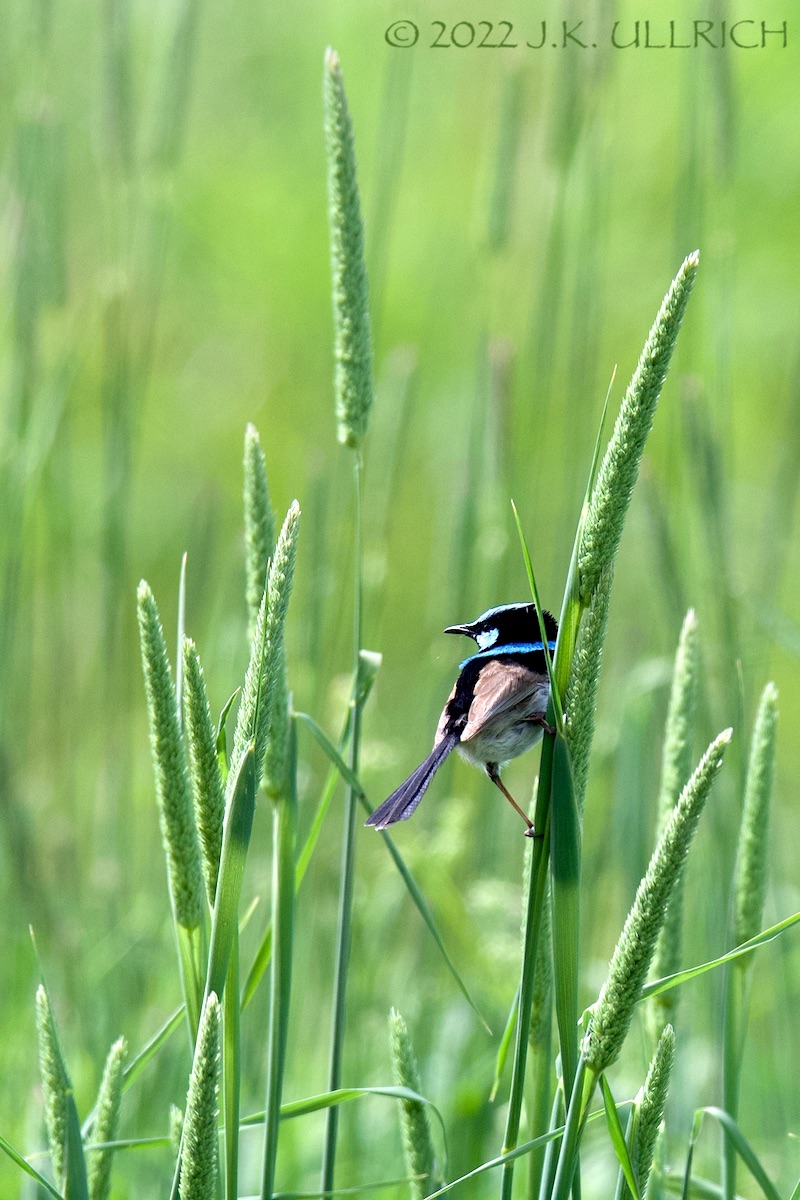 The trees gave way to an open grassland cut, and a much quieter fairy wren perched among dense reeds. He was too distant for my usual close-framed portraiture, but one of the camera techniques I’d intended to explore was journalistic shots that capture the bird’s environment. The result pleased me with its geometry and limited color palette. A few red-browed finches flew overhead as I moved around the reed bed, and perched in a tree surrounded by wattles. I waited, hoping they’d move to the yellow blossoms for an attractive picture. They did something better: descended to the grass and began plucking seeds. Lighter than the parrots, they could sit directly on the stem to feed. Fronds waved back and forth between us with each breath of wind. It took several shots, and a quick shutter finger, to catch one unobstructed.