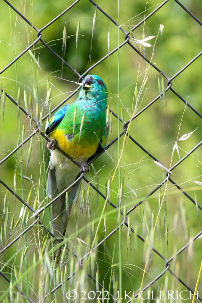 A few steps from the carpark, I saw a pair of red-rumped parrots using a chain-link fence to access seedy grass. A clever adaptation: the high stalks would have been difficult for the bird to reach or bend, but perching on the wire afforded an easy seat at the table! The parrots climbed the wire using beaks and claws. Maybe it’s the science fiction writer in me, but the image held a hint of dystopia: a rusty metal barrier unable to hold back nature, overgrown with foliage that sustains jewel-toned wildlife.