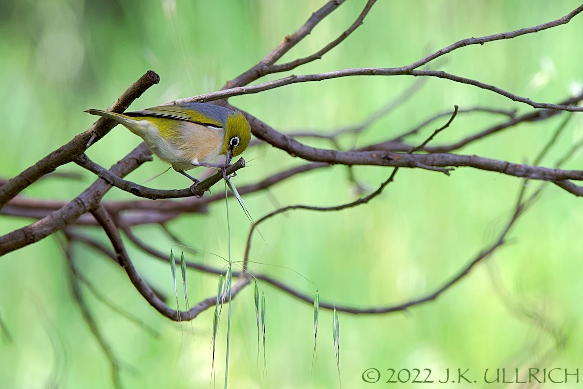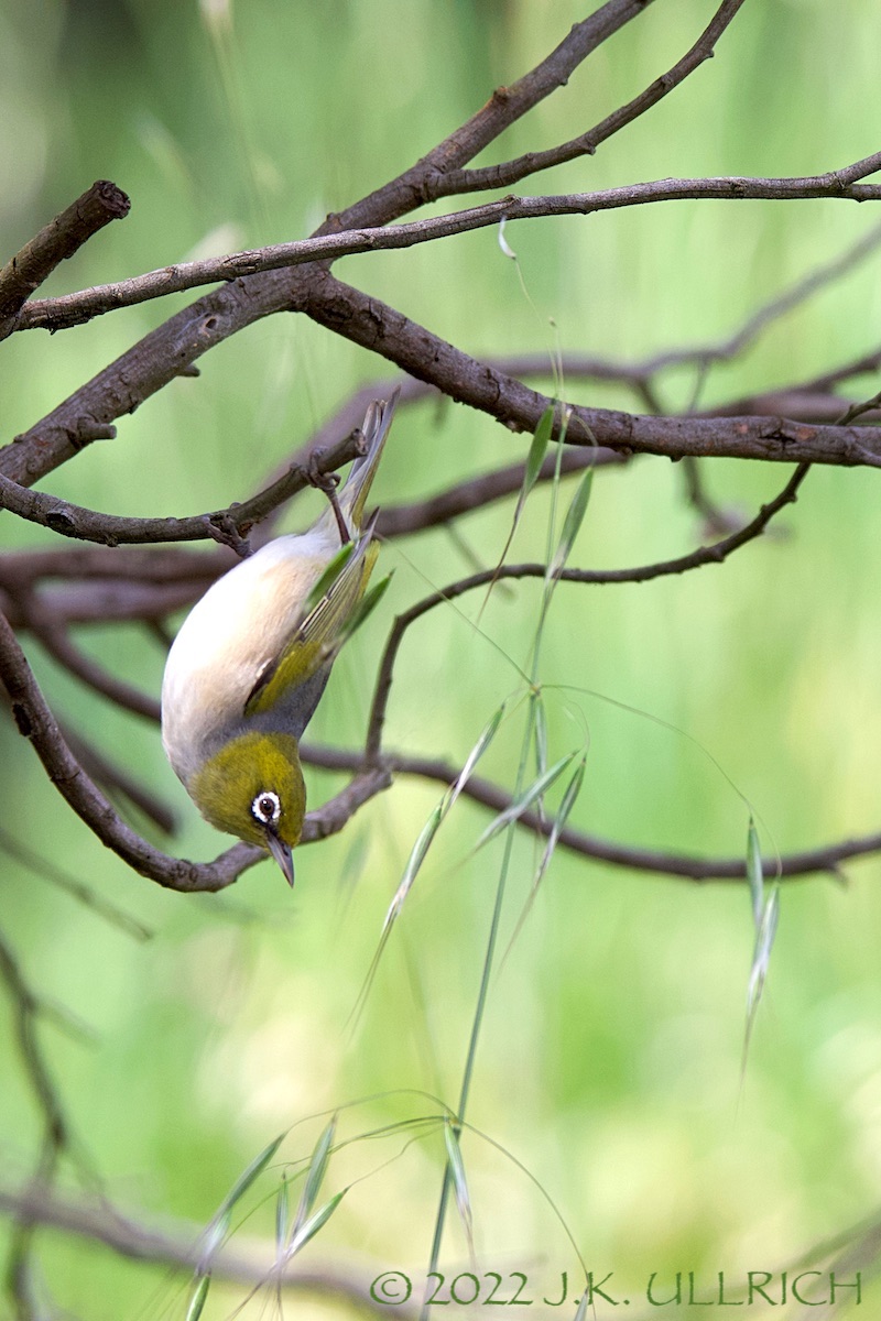 A silvereye that had tagged along with the finch flock stayed in the tree. Dangling upside-down from a branch, it stretched out to grab the top of a grass stalk, pulled the whole thing back to its perch, and snacked on the seeds. Silvereyes have often charmed me with their sprightly feeding antics, butI’d never witnessed this funny “fishing” behavior before!