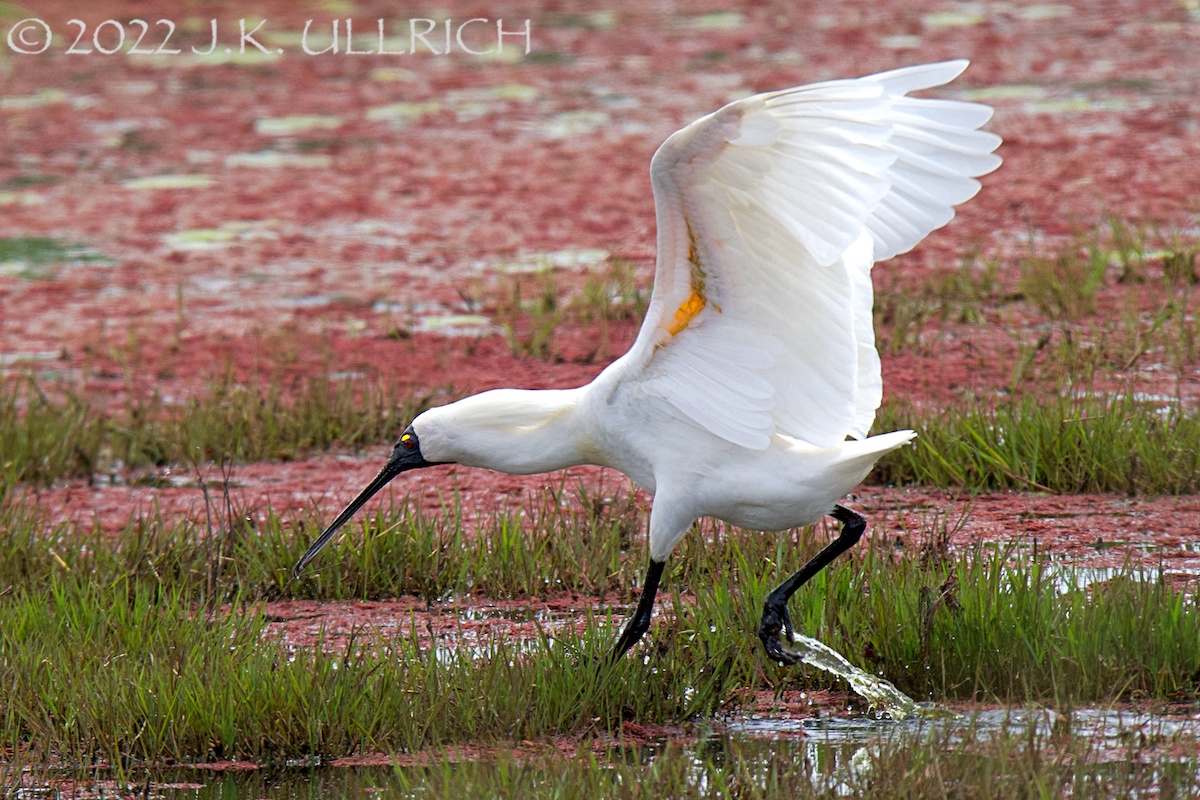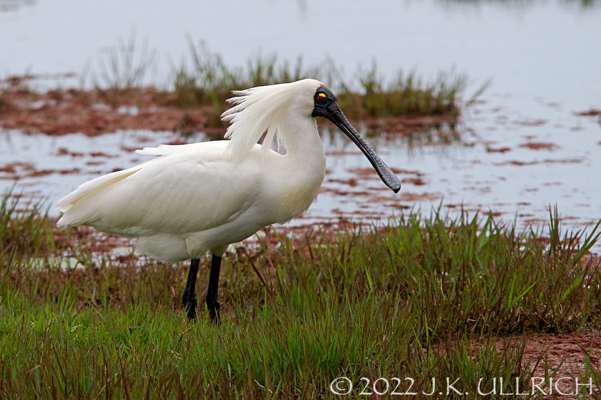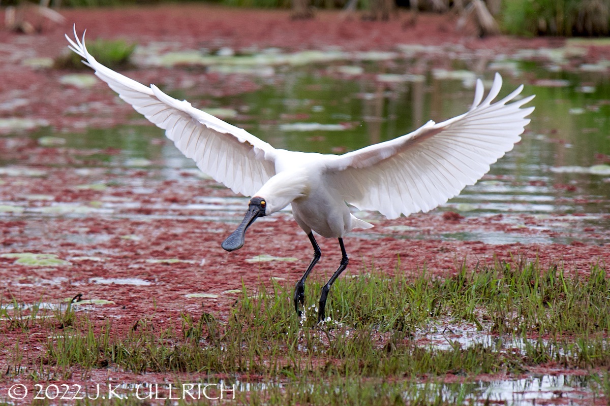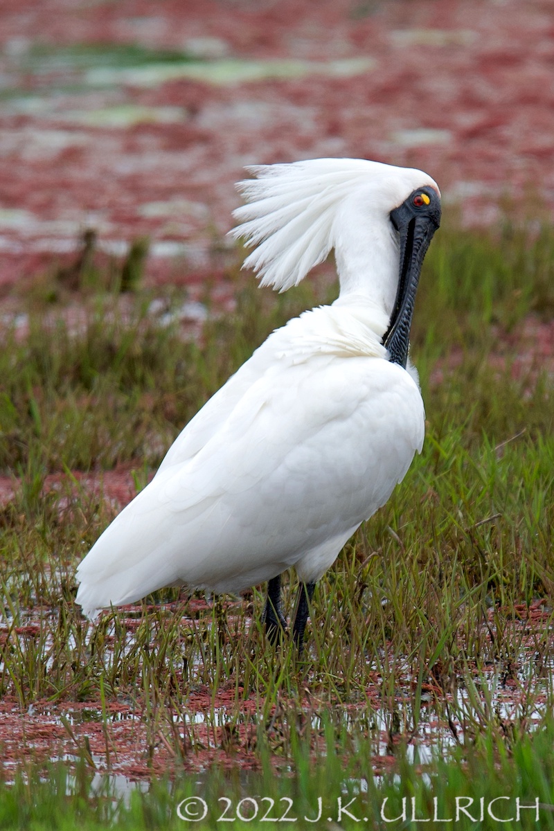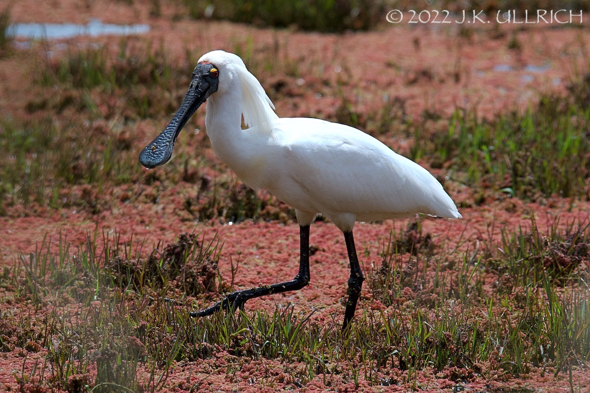 Rosy aquatic plants made a dramatic backdrop for a star appearance. A large white bird waded through the pond: I assumed it was one of the resident ibises, an ideal subject for experimenting with exposure compensation on pale feathers. But it moved more briskly than the “bin chickens” I’d so often observed there. Creeping closer, I caught my breath: it was a royal spoonbill. I first saw a member of this species in May, when we stopped to walk along Lake Colac on our long drive back from the Great Ocean Road. Clad in simple monochrome, he’d put away his pompadour for the season.