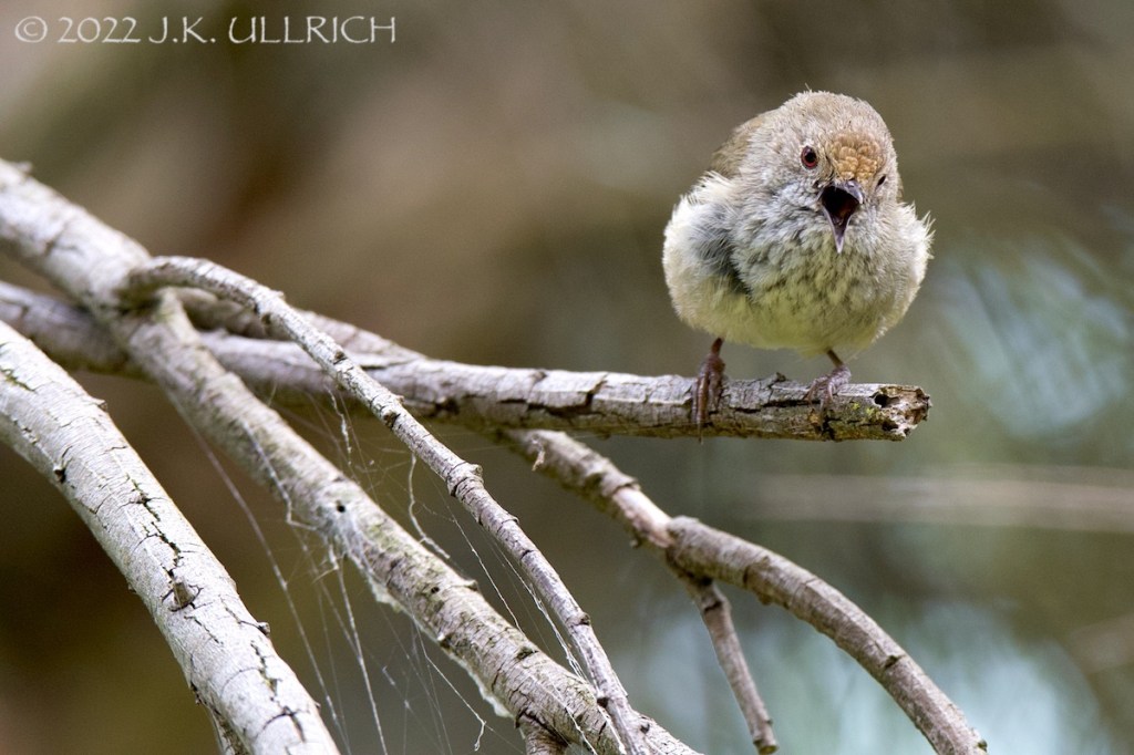 Traversing a woodland section towards the pond, a chorus of birdsong drew me down a side path. The undergrowth seethed with small birds! I counted at least five different species. Scrub and fairy wrens and scampered through the undergrowth. Had I stepped into one of those cheesy Disney movies where birds flock about the princess in an enchanted forest and sing with her? “I want adventure in the great wide somewhere… ” Before I could launch into my solo, this tiny thornbill seized a starring role in the musical. Amazing that this diminutive puffball can produce such a loud, robust buzzing sound! He sang a rhythmic bass line to the high reed and string melodies of the other birds.