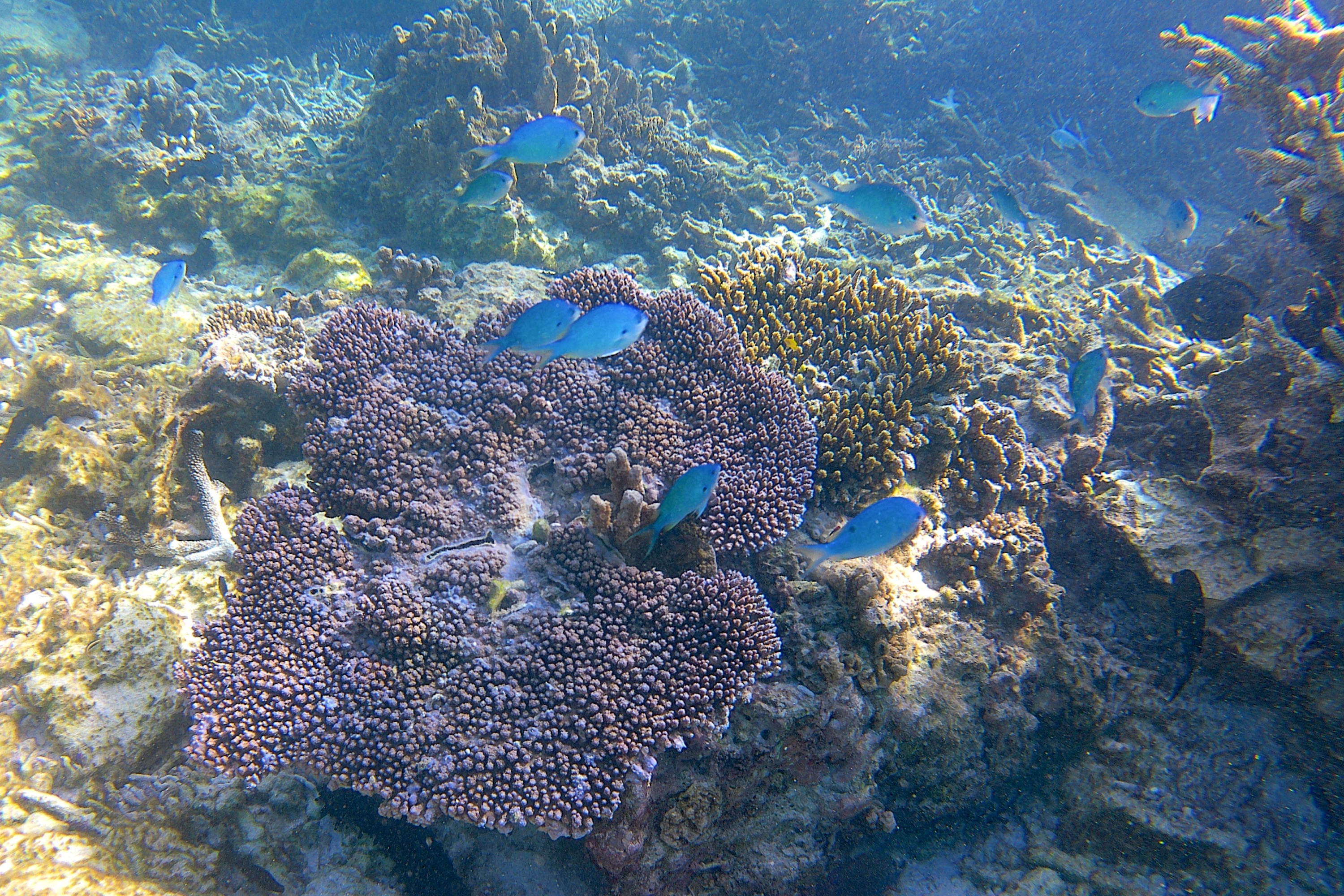 Disembarking on the grass airstrip, we met a noisy welcoming committee of black noddys. Named for their head-bobbing courtship displays, thousands of these birds nest assemble annually to nest (including in these “octopus trees”, so called for their tentacle-like racemes, which are among the first plants to establish forests in a coral island ecosystem). It was their resort as much as ours! Cacophonous shrieks and the earthy tang of guano filled the air. Numerous other species call Lady Elliot home, including various terns, sandpipers, and frigatebirds that spiral overhead like pterosaurs. Abundant birdlife, combined with the fossils exposed at low tide, give the island an atmosphere of primeval magic.